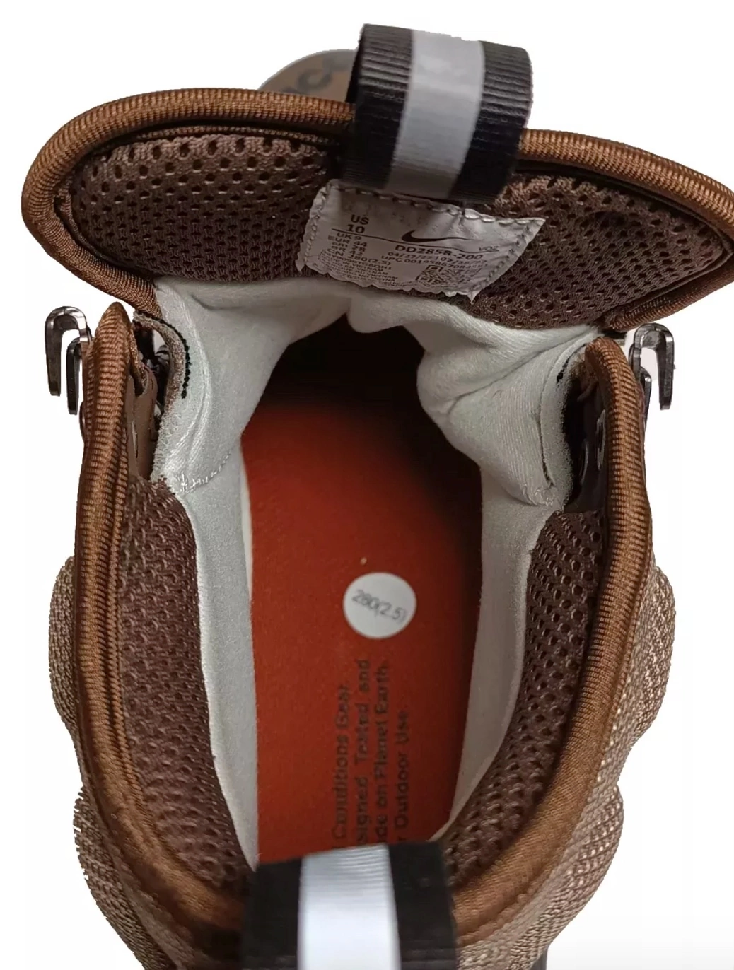 Цвет Trails End Brown — это дань уважения классической эстетике туристических ботинок, переосмысленная в футуристичном дизайне ACG. Глубокий коричневый оттенок с бордовым подтоном в сочетании с агрессивным черным протектором создает образ, готовый к любым испытаниям — от лесных троп до бетонных джунглей.